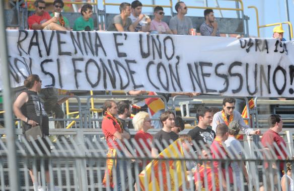 Rabbia, delusione, sangue amaro... sono queste le principali sensazioni che serpeggiano tra il popolo della Mero dopo questa giornata, che vede la gloriosa novantanovenne casacca Giallorossa retrocessa sul campo. Oggi in quattro e quattr'otto si è passati dalle lacrime di gioia versate dopo il gol del pareggio che significava salvezza, a quelle di dolore per l'atroce 2-3 a venti secondi dalla fine. "La Ravenna" che era oggi al Benelli non merita tutto questo, la Mero non merita questo, gli Ultras non meritano questo; già... la Ravenna che era oggi al Benelli e non tutta la città, perchè una larghissima fetta di ravennati, a cominciare dalla maggior parte dalle grandi aziende cittadine che in linea di massima non hanno mai mosso un dito per aiutare la squadra cittadina men che meno quest'anno, fino ad arrivare "agli intrighi di palazzo" da parte del Comune che non ha mai fatto intendere e capire da che parte sta, se n'è sempre fregata dei nostri colori. Dal nostro canto, ci sentiamo di uscire da questa stagione come vincitori: un'annata calcistica nata male e finita peggio dove abbiamo subito lo scandalo scommesse, l'avvento del maledetto Aletti, le polemiche, le collette, penalizzazioni che nel corso dell'anno continuavano impietose a mietere punti di penalità al già disastrato Ravenna, prestazioni della squadra non sempre accettabili; ci sentiamo vincitori perchè tutto questo avrebbe "ammazzato" chiunque, ma noi no; noi al fianco dei nostri colori c'eravamo, ci siamo e ci saremo... sempre!