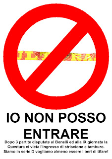 "Io non posso entrare": questa frase è spesso affissa alle vetrine quando i nostri animali non sono benvenuti. Proprio come i cani devono restare fuori dai negozi quando troviamo questo cartello, l'ultima novità vuole che tamburi e striscione restino fuori dallo stadio. Ecco il motivo principale per il quale oggi abbiamo deciso di attuare questa forma di protesta rimanendo all'esterno dello stadio, distribuendo i volantini che trovate nelle foto sotto e creando un corteo che ha percorso le strade attorno all'impianto. Un accanimento della Questura nei nostri confronti che non capiamo e non vogliamo capire visti e considerati sia la serie in cui milita la nostra squadra, sia il fatto che per le prime giornate non vi era stato problema alcuno e visto anche il fatto che in trasferta quest'anno non abbiamo avuto nessun tipo di problema a riguardo. Problematica che però oggi hanno trovato i nostri avversari della Virtus Verona, i quali si sono visti rifiutare l'ingresso dei propri striscioni e dei propri vessilli; con grande rispetto e senso di solidarietà verso i nostri confronti, la tifoseria Rossoblù ha deciso di rimanere fuori dal Benelli per esprimere il proprio dissenso a tali provvedimenti. E' inutile rimarcare che nessun disordine si è verificato se non porre l'accento con grandissimo senso civico su una problematica che tutto il pubblico Giallorosso conosce sin troppo bene, ma che spesso l'opinione pubblica snobba o fa finta di non vedere. VOGLIAMO ESSERE LIBERI DI TIFARE!!!