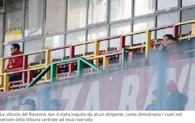 La foto, tratta da "La Voce di Romagna" di oggi, si riferisce all'ultima partita casalinga contro il Camaiore, è di per se molto eloquente: quale società al mondo, anche militante nel campionato più infimo, non ha nemmeno una figura dirigenziale in tribuna a seguire la partita? La risposta è semplice quanto disarmante: il Ravenna... VERGOGNA! Ciò dimostra quanto chi ha in mano le sorti dei nostri colori, tenga poco a questa maglia e tantomeno ai suoi esasperati tifosi.